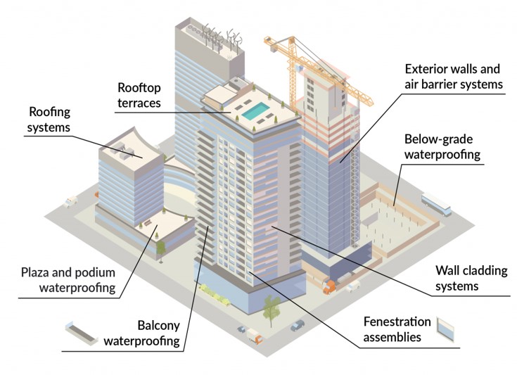 - Explain how architectural drawings are sometimes lacking in structure amenable to waterproofing and air-barrier leakage.